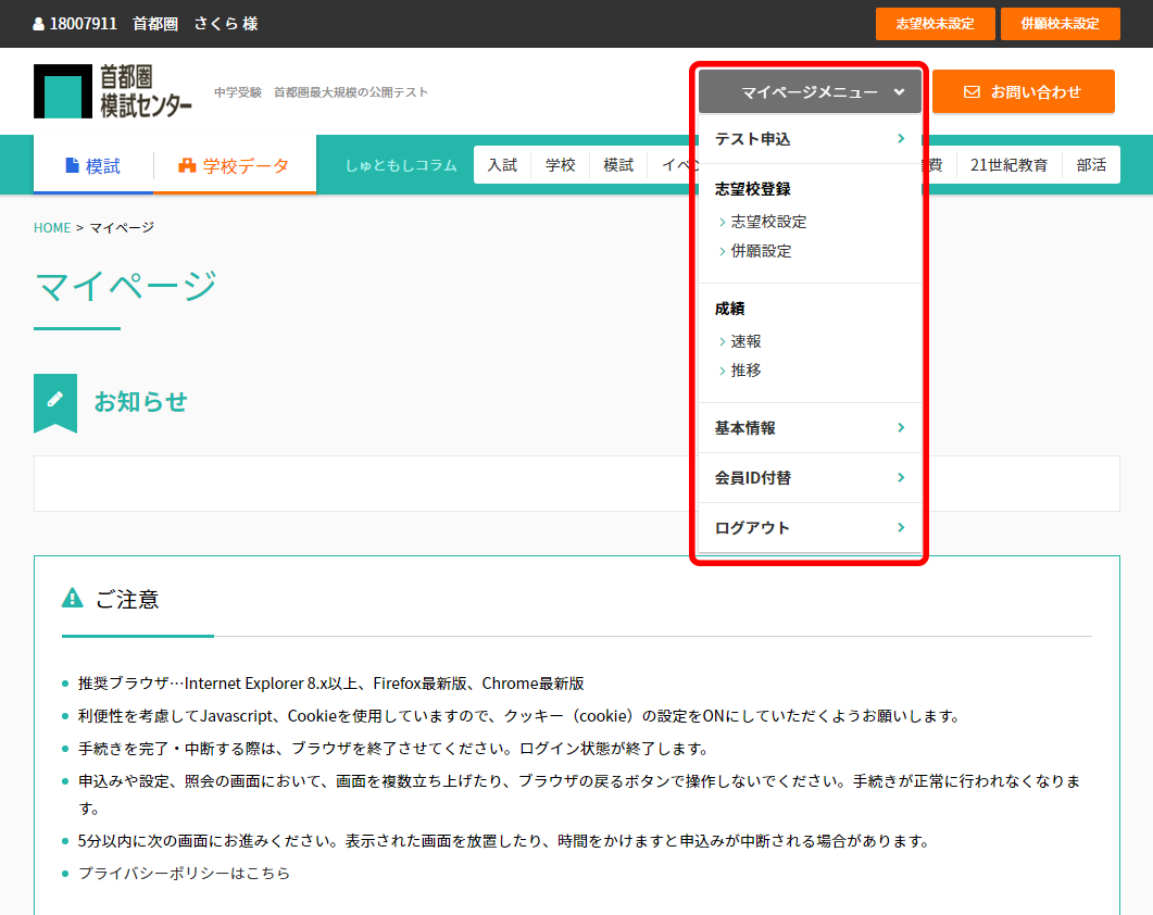 マイページメニューのご案内