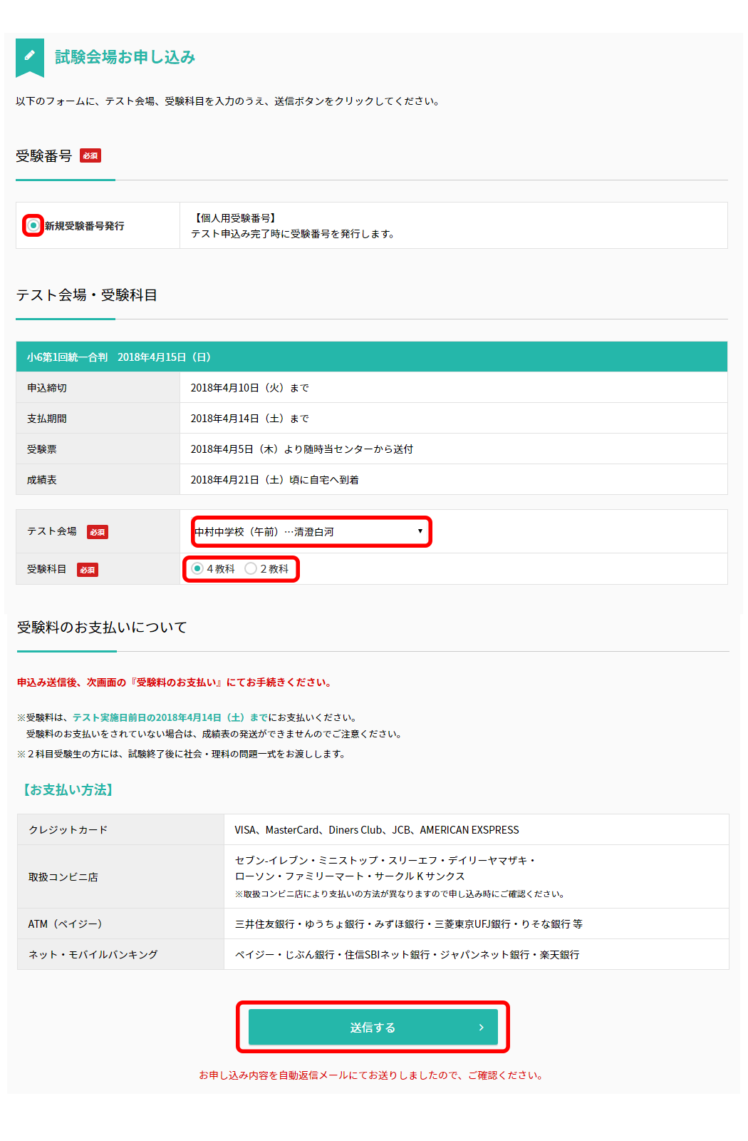 [新規受験番号発行]にチェックを入れ[テスト会場]と[受験科目]を選択し[送信する]をクリックして申し込み完了。