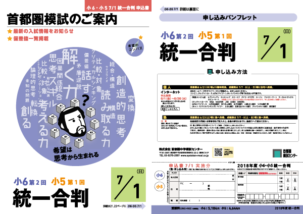 統一合判のパンフレットは小6と小5が一体化になり、模試の概要や入試情報も掲載した冊子になります。また、複数の実施日の申込書をまとめた形式になります。詳細はPDFファイルをご確認ください。