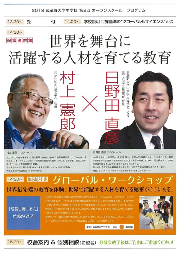 6月22日に行われる同中学校の第2回オープンスクールでは、14時30分から保護者を対象に、「世界を舞台に活躍する人材を育てる教育」というテーマで、元Google日本法人社長の村上憲郎氏と日野田校長の対談が行われます。