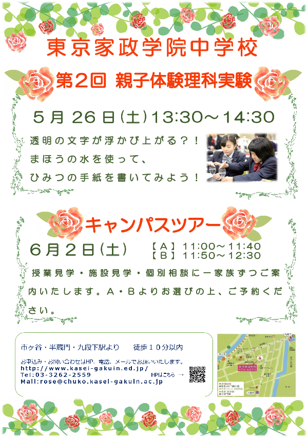 東京家政学院中学校で開催されている親子体験イベント。第1回は4月28日に開催し、英会話体験「ファーストフード店での英会話に挑戦しよう Let's try ordering fast foods in English!」が行われました。その第2回にあたる、親子体験イベントが5月26日(土)に開催されます。第2回は理科実験「透明の文字が浮かび上がる?!まほうの水を使って、ひみつの手紙を書いてみよう」が予定されています。
