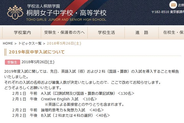 桐朋女子中学校(東京都・調布市。女子校)が来春2019年入試で、2月1日午後に募集定員10名で「Creative English入試」を新設することを公表しました。具体的な試験科目についてはまだ明記されていませんが、内容に英語による面接官とのやりとりが含まれるということです。