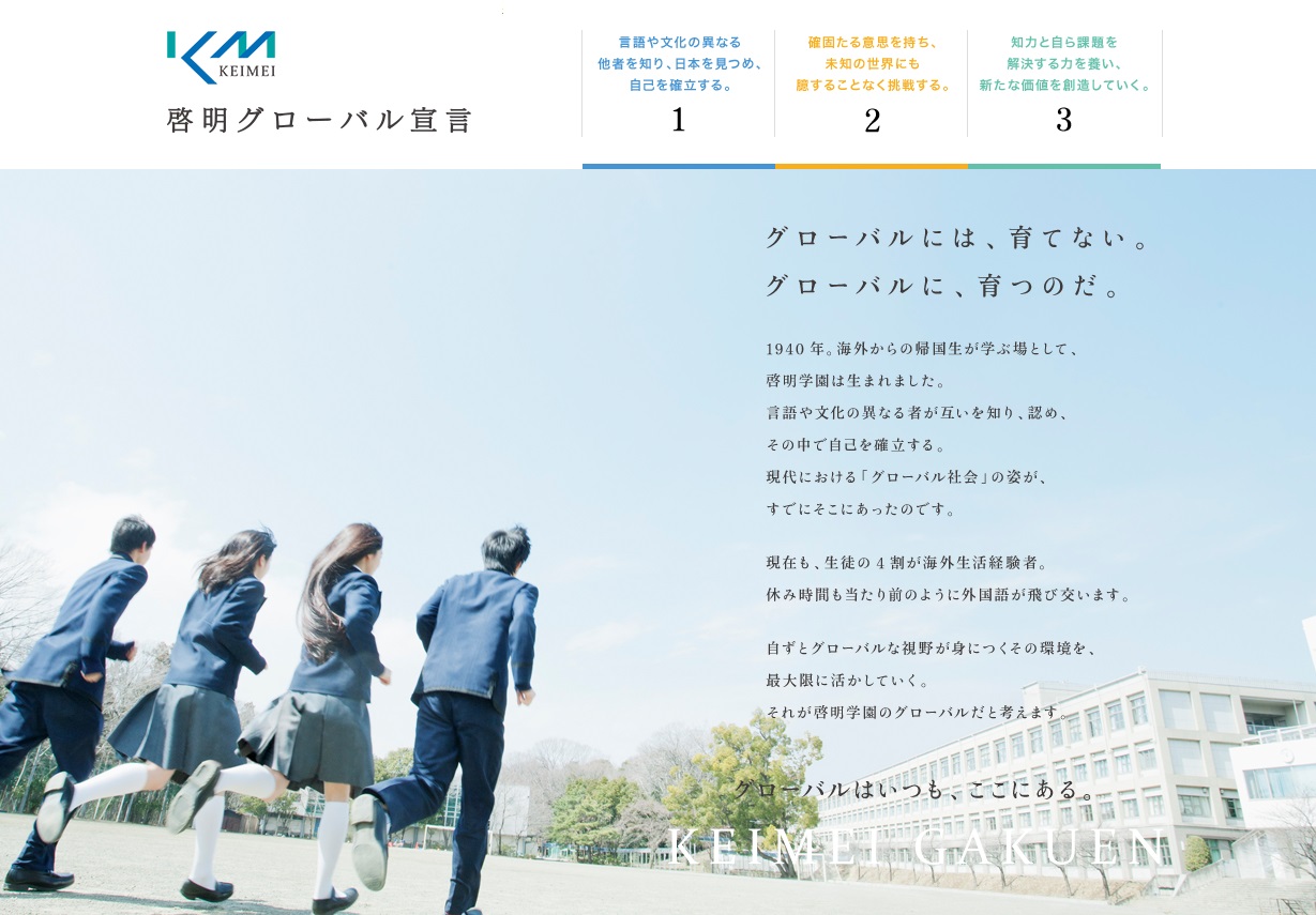 啓明学園は帰国生受け入れのために創立された学校。現在でも、全校生徒の37%が国際生(帰国生・国内インター校出身者・外国籍の生徒)です。生徒一人ひとりの学習歴にあわせた“オーダーメイドの時間割”を作成し、ホームルームクラスは一般生と同じで、国語、数学、理科、社会は取り出し授業を行い未学習領域の学習をサポートします。