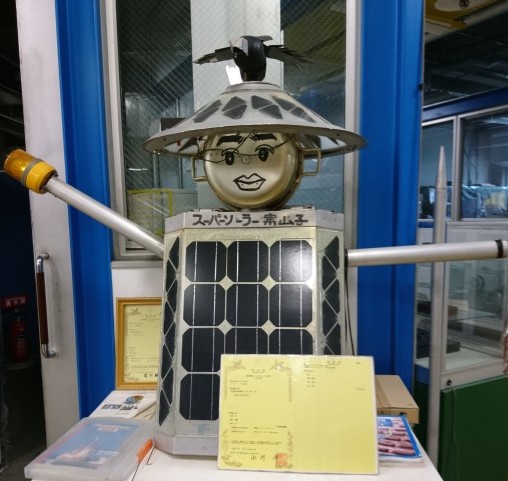 さて同校では、ニホンミツバチを飼育するロジェクトにも取り組んでいますが、グリーンカーテンやごみを土にリサイクルするミミズのコンポストなどエコキャンパスの取り組みと理科の学習の連携もあります。校舎に入り工房に足を運ぶと、“スーパーソーラー案山子君”がお出迎え。太陽電池を電源にして、音や回転で鳥や害虫から作物を守る“案山子”で、日本工業大学が特許を取ったもの。この工房でもアイドル的存在です。