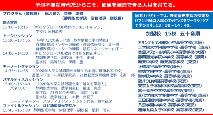 同機構同士校の聖学院の先生方もかけつけ、21世紀型教育がいかに生徒1人ひとりの未来における価値を創造する教育なのか解き明かしていきます。この静岡聖光学院と聖学院の協働シンポジウムが、より静岡だから21世紀型教育の特色も映し出すでしょう。