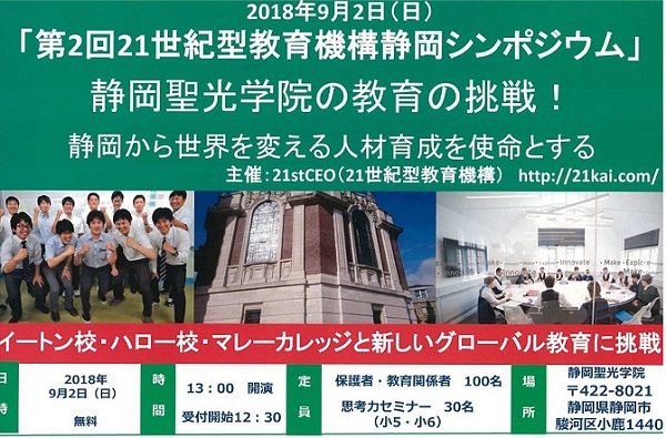 9月2日(日)、13:00から、静岡聖光学院〈静岡・静岡市。男子校〉にて、第2回「21世紀型機構(21stCEO)」静岡シンポジウムが開催されます。