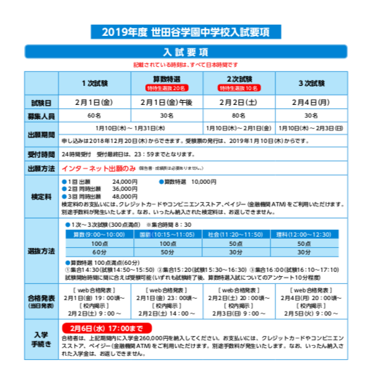 2019年入試要項を公表、HPにもアップされ、詳細が判明しました。2月1日午後の算数特選は集合・試験時間を3つ設定、発表は当日発表です。