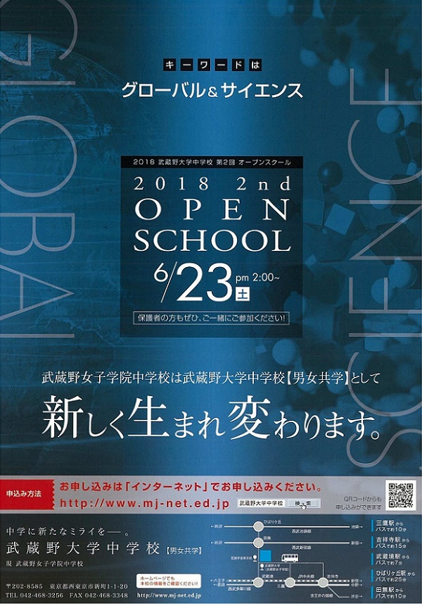 キーワード「グローバル&サイエンス」のもと、「武蔵野女子学院中学校は武蔵野大学中学校【男女共学】として“新しく生まれ変わります。”と掲げられた案内の結びには、「中学に新たなミライを――。」と記されています。