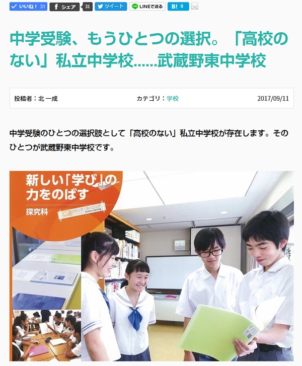 この武蔵野東中学校の教育については、昨年この「受験情報ブログ」のコーナーに「中学受験、もうひとつの選択。『高校のない』私立中学校......武蔵野東中学校」と題した記事でご紹介していますので、関心のある方はこちらの記事もぜひご覧ください。