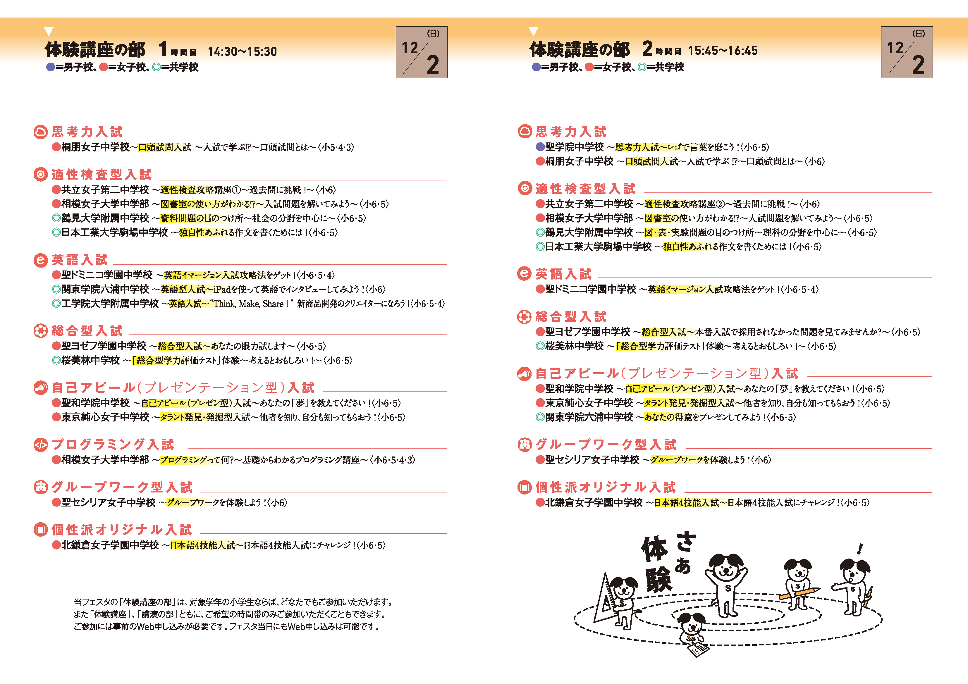 ■内容 【体験講座】私立中が行う小学生向け体験講座と、様々な新入試タイプの内容について、参加校の先生が語る「新入試タイプ別」パネルディスカッション。