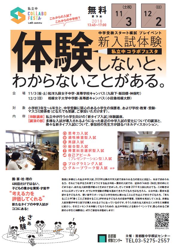 首都圏模試センターでは、次回の「小6統一合判」模試が行われる11月3日(土・祝)に、和洋九段女子中高会場にて「午前の部」模試の終了後、13:45から17:00の時間帯に「新入試体験! 私立中コラボフェスタ」を、今年も開催する運びとなりました。