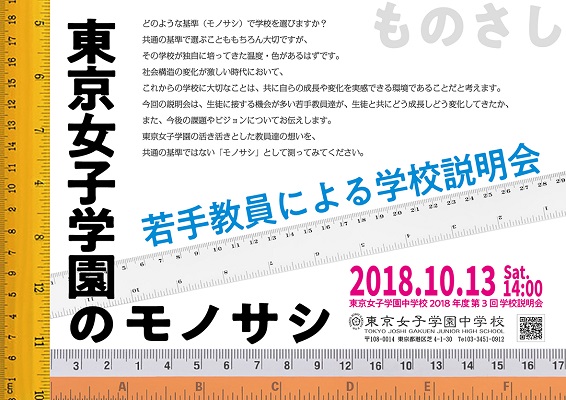 東京女子学園では、10月13日(土) 14:00~ 「東京女子学園のモノサシ」 若手教員による中学説明会を開催します。
