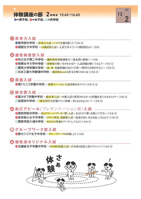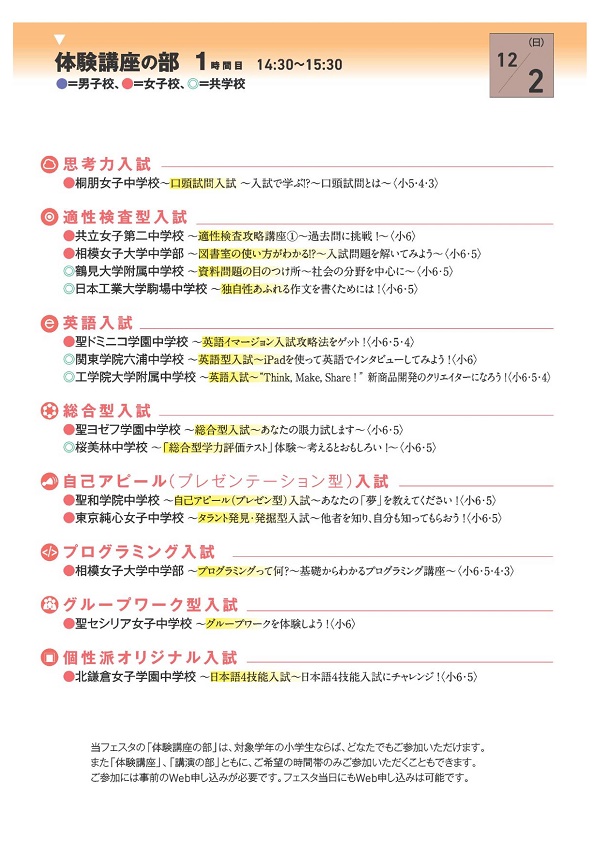 12月2日(日)PM開催の「新入試体験!私立中コラボフェスタ」(相模女子大学中高会場)の「体験講座の部」時間割と「講演の部」の内容詳細をお知らせします(添付の資料をご覧ください)。