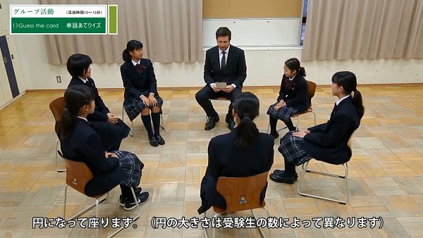 ネイティブスピーカーとの英語活動は、まずグループでのアイスブレイク、次に受験生同士でカードを使って質問しあう、そして再びグループで活動という3つのパートから成ります。英語活動の後、ネイティブスピーカーと5分程度の個別面接。活動の評価は日本人教師が、個別面接はネイティブスピーカーが、ルーブリックに基づき評価します。面接では、対話力や対話を深める力が見られます。