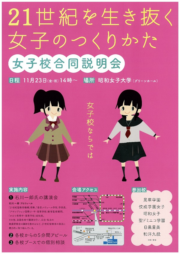 11月23日(金・祝)14時から、世田谷の昭和女子大学(東急田園都市線(半蔵門線直通)「三軒茶屋」駅下車徒歩7分)のグリーンホールにて、世田谷区および近隣エリアの私立女子校が6校集って、「21世紀を生き抜く女子のつくりかた」と題した講演会・合同相談会を開催します。