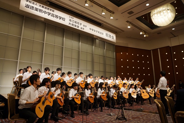 この11月27日(火)の祝勝会に集った約250名の来賓、来客、学校関係者、在校生と保護者を会の冒頭で迎えてくれたのは、こちらも全国トップレベルの活躍をしている淑徳巣鴨中学高等学校ギター部による「歓迎の演奏」でした。