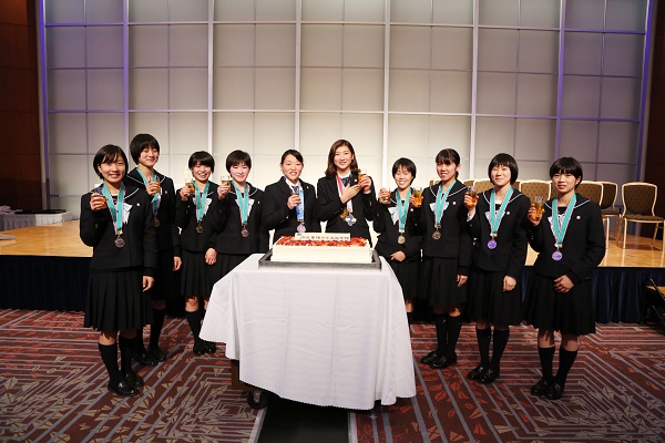 会場となった東京ドームホテルからは、表彰された選手の皆さんにサプライスで大きなケーキのプレゼントが用意され、そのケーキを見た瞬間には、中高生らしい無邪気な喜びの表情が…。楽し気にケーキとも並んで写真を撮ってもらう姿からは、淑徳巣鴨中学高等学校での伸びやかな学校生活の姿も想像されました。