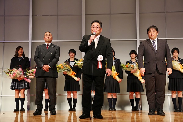 学校法人大乗淑徳学園理事長の長谷川匡俊氏、浄土宗社会国際局長の杉山俊明氏、東京私立中学高等学校協会会長の近藤彰郎先生から祝辞と記念品、目録などを頂く選手の皆さんには、はじめは緊張した様子も見られましたが、次々と各関係者の来賓から寄せられるお祝いの言葉に、少しずつ表情も和らいでいったようです。