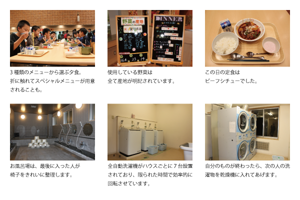 食堂棟に続々と生徒が集まり、夕食の時間が始まります。この日のメニューは「ビーフシチュー」「ねばねば丼」「醤油ラーメン」の3種類。使う食材の産地も明記されており、食に対する意識も自然と身につきます。食事が終わるとそれぞれのハウスに戻り、洗濯や入浴など身の回りのことをてきぱきとこなします。