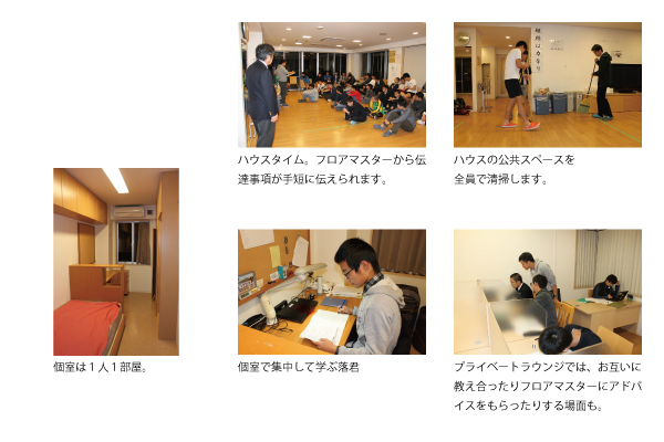 生徒は全員、12棟あるハウスのいずれかに入居。一棟あたり約60名が共同生活を送ります。各ハウスには、ベテラン教員や社会人として長いキャリアを持つハウスマスター、日本の各分野を代表する企業の若手社員が派遣されるお兄さん的立場のフロアマスターがいます。授業を教える教員とはまた異なる立場で、精神面でもキャリア教育の面でも生徒の成長を支えています。