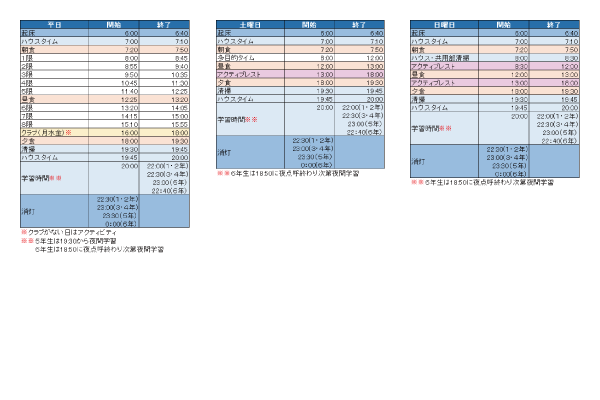 消灯時間は学年によって異なりますが、6年生でも24時が消灯時間。時間になると個室と廊下の電気は完全に消えます。起床時間は6時から6時40分。6年生でも最低6時間の睡眠時間があります。やることは多いですが集中して効率的に行い、休むべき時間はしっかり確保するという健康を第一に考えた生活パターンが実践されています。