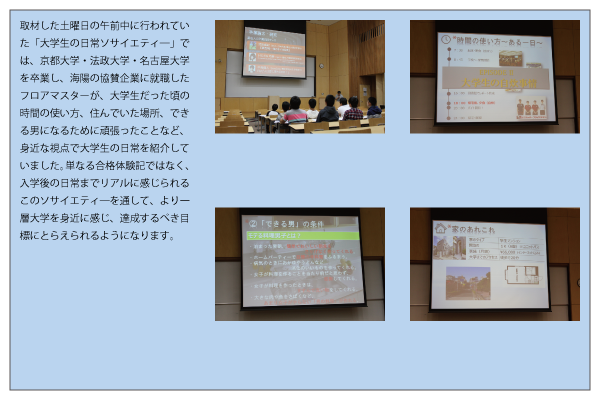 海陽学園の魅力の一つに「ソサエティ」があります。これは各企業から派遣されたフロアマスターがそれぞれの個性や特色を生かしたキャリア教育です。この日は自主参加の「大学生の日常ソサイエティ―」か開催され、京都大学、法政大学、名古屋大学を卒業したフロアマスターが、勉強面に限らずアルバイトや生活環境まで含めた大学生活の実際を包み隠さず紹介していました。生活の場で身近に接している難関大学出身のフロアマスターが自分自身の経験を紹介するため、生徒たちもそれらの大学をより身近に感じることができます。