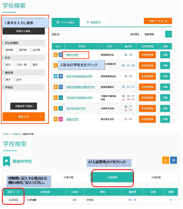 学校データベースでの番号検索方法