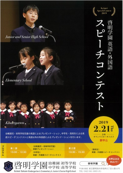 啓明学園では、来る2月21日(木)に、英語・外国語スピーチコンテストを開催します。八王子駅に程近いオリンパスホール八王子を会場とし、広く一般の方々にも公開します。