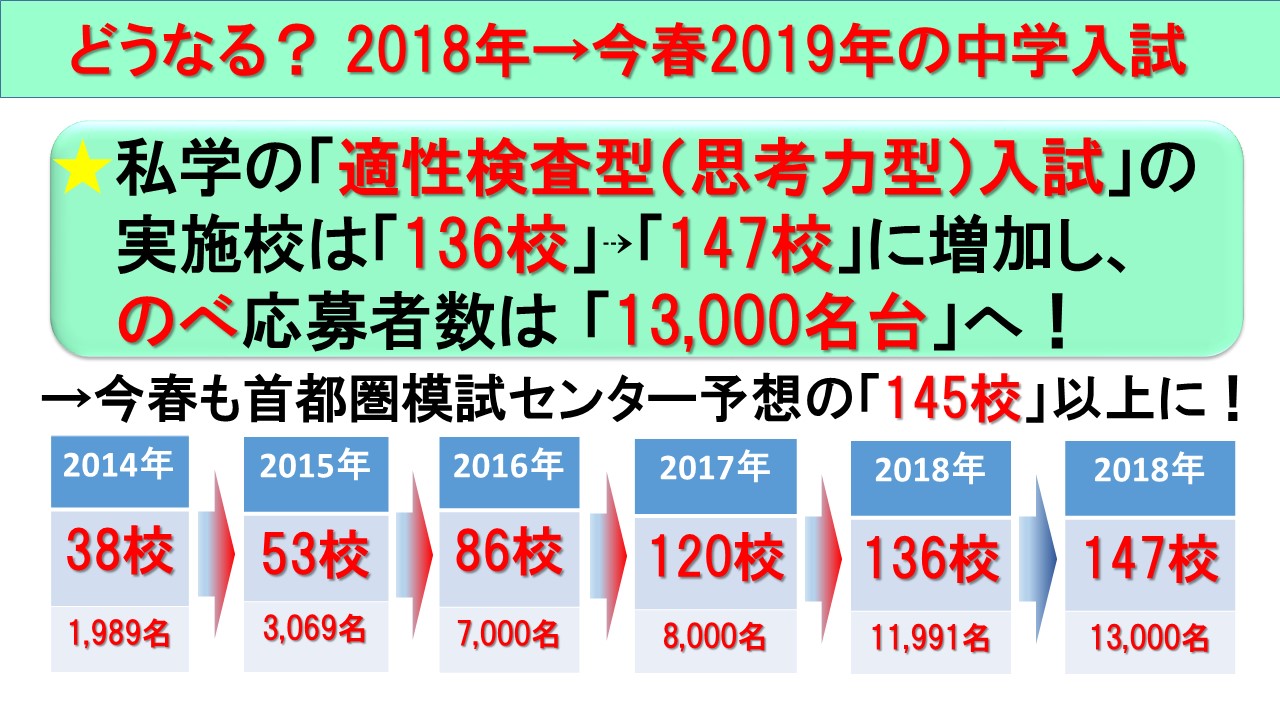 首都圏の中学入試では、2014年から2018年にかけて、「適性検査型(総合型・思考力・自己アピール)入試」を実施した私立中学校は、38校→53校→86校→120校→136校と、年々増加してきましたが、さらに今春2019年入試では、計147(前年プラス11)校の私立中が、こうした「適性検査型(総合型・思考力・自己アピール)入試」を実施することが判明しました。