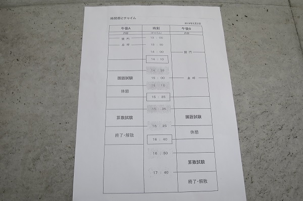 「お子様が十分に力を発揮されることを願って、挨拶に変えさせていただきます」と鈴木先生のことばが締められた後には、担当の先生より試験問題の回収についてや試験終了後の解散のことなどの諸注意がありました。