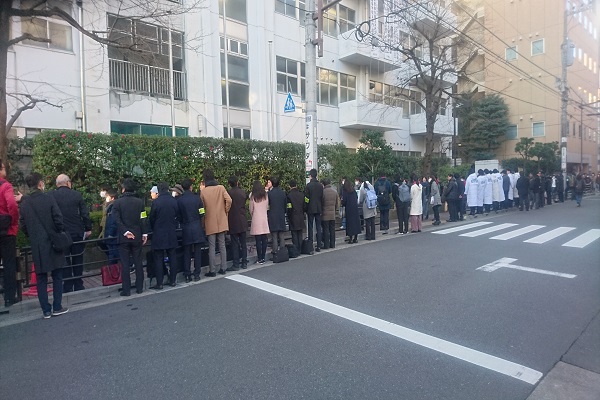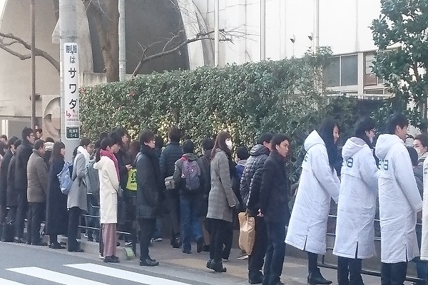 都立中高一貫校の集合時間は8時30分です。7時すぎくらいから、受検生を激励するため大勢の塾の先生方が正門の前の歩道に横一列になって並んでいきます。