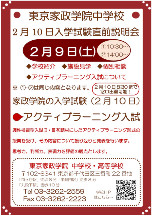 東京家政学院中学校・高等学校<東京都・千代田区>では、2月10日(日)に行われる「アクティブラーニング入試」に向けて、2月9日(土)に入試直前説明会を実施いたします。Web出願は各試験日の朝6時まで、午前試験は当日窓口で出願を、8時~8時半の間で受け付けており、出願をまだ決めていない方にぜひ参加していただきたい説明会となっております。
