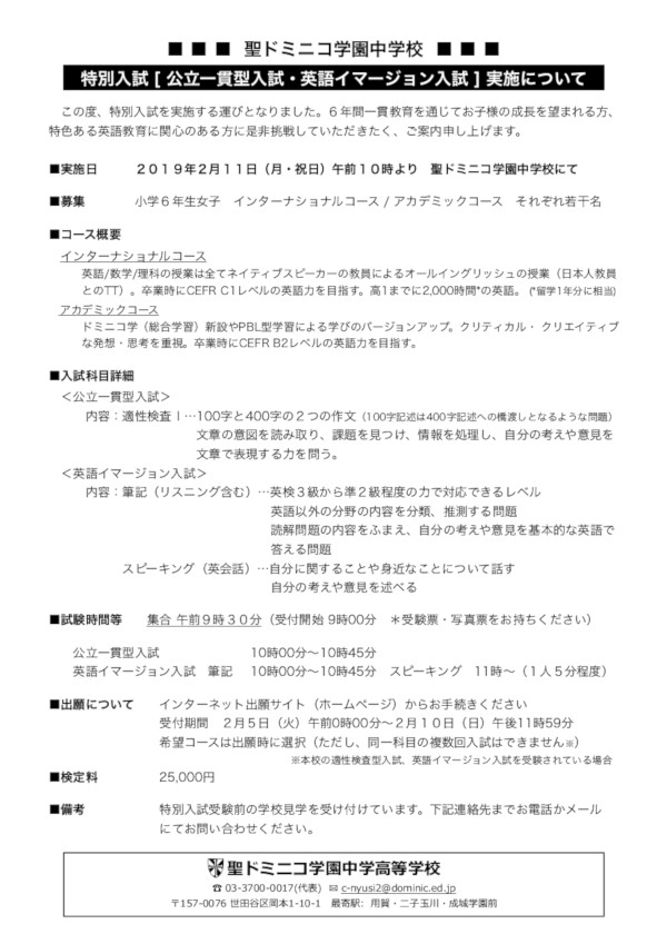 2月11日(月・祝)特別入試「公立一貫型入試・英語イマージョン入試」の実施を発表! - 聖ドミニコ学園