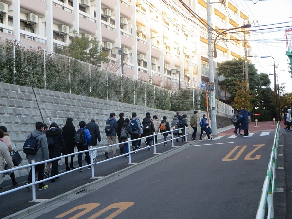 7時を回った頃から登校してくる受験生は増え始め、7時20分ごろには登校のピークを迎えました。海城の正門へと続く緩やかな坂道では、受験生親子の列が途切れることなく続いていました。