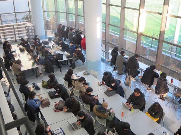 エレベーターが閉まって我が子の姿が見えなくなると、保護者はいったん帰路につくか、保護者控え室となっているカフェテラスや講堂へと向かいます。