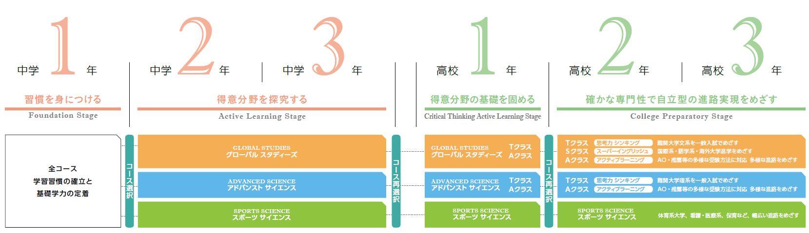 そのため中学校からの一貫部では、中1の1年間を、学習習慣の確立と基礎学力の定着のための「ファウンデーションステージ」と位置づけ、中2からの得意分野を探求する「アクティブラーニングステージ」では、上記の3コース選択制が導入されています。