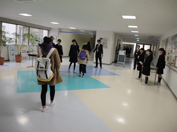 文化学園大学杉並の入試では、在校生によるお出迎えがお馴染みの風景です。受験生一人一人に在校生が寄り添うようにして話しかけ、緊張をほぐしながら集合場所の校舎まで案内していきます。