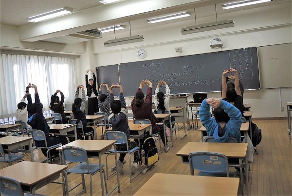 試験開始直前に放送が流れ、校長先生から激励の言葉が伝えられます。緊張をほぐすための軽い運動も行いました。