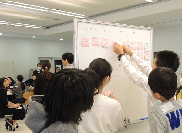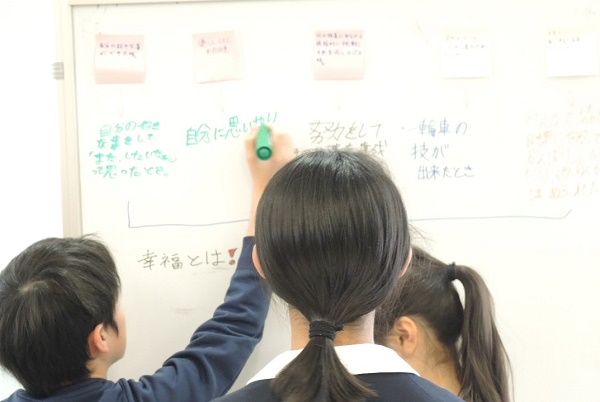 かえつ有明中学校〈東京・江東区。共学校〉では昨年まで2月4日に実施していたアクティブラーニング思考力特待入試(以下AL入試)を今年は2月2日午前に前倒しして実施しました。 これは、受験者数の確保を重視していた段階から、AL入試をあえて選択してでもかえつ有明を第一志望とする受験者にターゲットを絞り込もうという段階にアドミッションポリシーがシフトしたことを意味しています。 このシフトはかえつ有明の教育内容に対する自信の表れでもあります。大学進学実績という定量的な面だけではなく、生徒が主体的に社会に関わるその活動に対する手ごたえが先生方の中に確実に広がっているのです。 生徒の主体的な活動というのは、NHKニュースで取り上げられたり、学校ホームページでプロジェクト科の取り組みとして紹介されたりしているので、ご存知の方も多いかもしれません。正解のない実社会の問題に向き合い、協働的で主体的な学びを実践しているのが、かえつ有明のアクティブラーニングなのです。 このような学びのスタイルに共感し、いつかは自分もそのような学びに参加したいという気持ちを持つ受験生が集まってくるのがAL入試です。その入試を運営し、評価する先生方もそこに賭ける思いは並々ならぬものがあります。 この日も30名ほどの先生方がこの入試の準備・運営のために集まりました。 かえつの先生方がAL入試に並々ならぬ思いを持って取り組むのは、それがカリキュラムポリシーの根幹を表現しているからに他なりません。 知識や論理といった「学び方を学ぶ」次元(かえつではそれをA軸と呼びます)だけではなく、自分を確立し表現するB軸や、仲間や社会と共に生きるC軸に合致する入学試験を作り上げるためには、それなりの長い準備が必要です。 昨年10月頃から「知のコード」プロジェクトメンバーがコアとなって、AL入試の作成会議が開始されたそうですが、さらに遡れば、このプロジェクトは4年前から動いていてビジョンの共有はそこから形成されています。放課後などの時間で先生方が自主的に研修を行い、そこでの対話を通して連携できるチームの輪が年々広がってきたのです。 朝の打ち合わせで、ファシリテーターである佐藤先生と古賀先生が、準備をしてくれた先生や評価役の先生に挨拶しました。これまでの積み重ねが脳裡をよぎったのでしょうか、佐藤先生が思わず感極まるシーンもありました。 受験生が会場に案内され円形のテーブルに座ってしばらくすると、「アイスブレイクお姉さん」こと斉藤先生が登場。身体を使ったゲームを受験生とともに行います。 グループ内での自己紹介や、身体と気持ちをほぐすゲームが終わる頃には、初めて会った「見知らぬ受験生同士」から、安心安全の場を形成する「チームの仲間」へと意識が変化しているのです。 ―あなたが『うれしい』と感じるのはどんなとき?― 最初の問いがファシリテーターから発せられ、チーム内での対話とディスカッションが始まります。発言者の主張に耳を傾け、そこに自分の考えや疑問を付加していきます。 そもそもお互いの主張によって対立を作り出すような質問ではありませんから、相手への傾聴力が発揮され、問いと主張のバランスが取れた「相互探求」の状態が作られます。 この後、「幸せ」について考える問いがいくつか続き、受験生たちは自然発生的に付箋やホワイトボードを使い始めます。 チームごとにアプローチは様々で、ホワイトボードをあまり使わずに議論に打ち込むところもあれば、マインドマップを作って、入念に意見を記録していくところもあります。 この段階で、チームによっては「うれしい気持ち」をグルーピングしていたことも注目に値します。ファシリテーターなしで、自分達で問いを発展させるプロセスこそ主体的な学びのエンジンです。 グループワークがしばらく続いた後、ファシリテーターから『幸福な王子』のストーリーが口頭で語られました。 この寓話から再度幸せについて考えるように発せられたことからも、結果ではなく成長に目を向ける存在のあり方、物質的に満たされることよりも精神的な満足を重視する社会を追求したいというかえつ有明の先生方の思いが伺えます。 対話とディスカッションが進んでいくにつれ、思考が開かれた状態になり、受験生の表情も柔らかくなっているのに気づきます。同じ対話型の入学試験でも「チュートリアル方式」と呼ばれるオックスフォードやケンブリッジの最終面接では、面接官との対話を通して思考が導かれていくものです。 また、中学入試でも麻布中学などの問題では「問いの流れ」という呼び方で対話的思考の要素が埋め込まれていることが知られていますが、こちらも言わば作問者との対話であって、チームで思考するものではありません。 そういう意味で、チームで思考する「かえつ有明AL入試」は、これからの時代に要請される画期的なものだと言えるでしょう。その評価をど