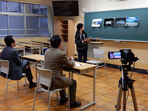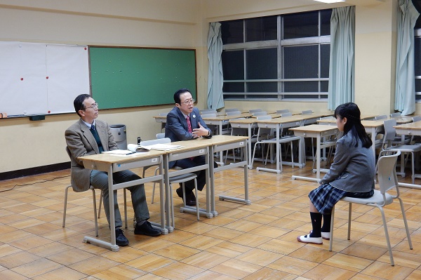 一教室あたり2~3名の聞き手の先生方は、校長先生や教頭先生など管理職と、英語担当の先生方は変わりませんが、その他の先生は、個々の受験生がプレゼンテーションするテーマに合わせて、それを聞いて評価するのにふさわしい(担当教科の)先生方に入れ替わります。