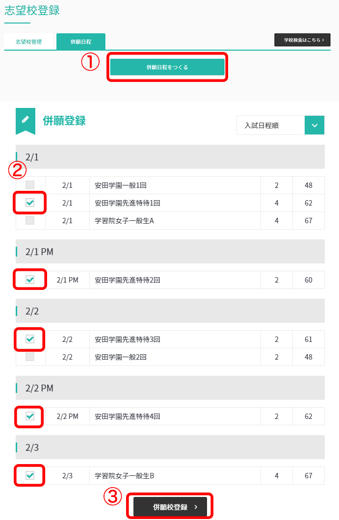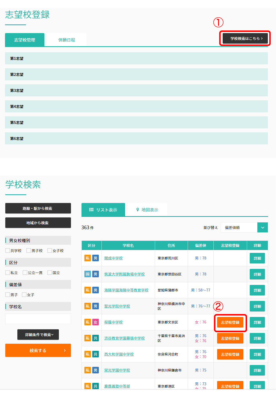 ボップアップ画面が表示されるので[志望校を登録する]をクリック。