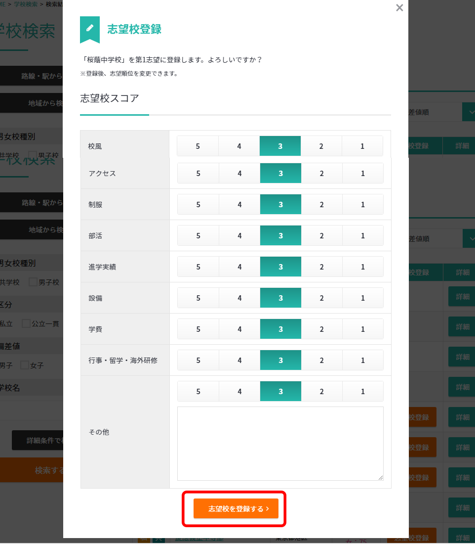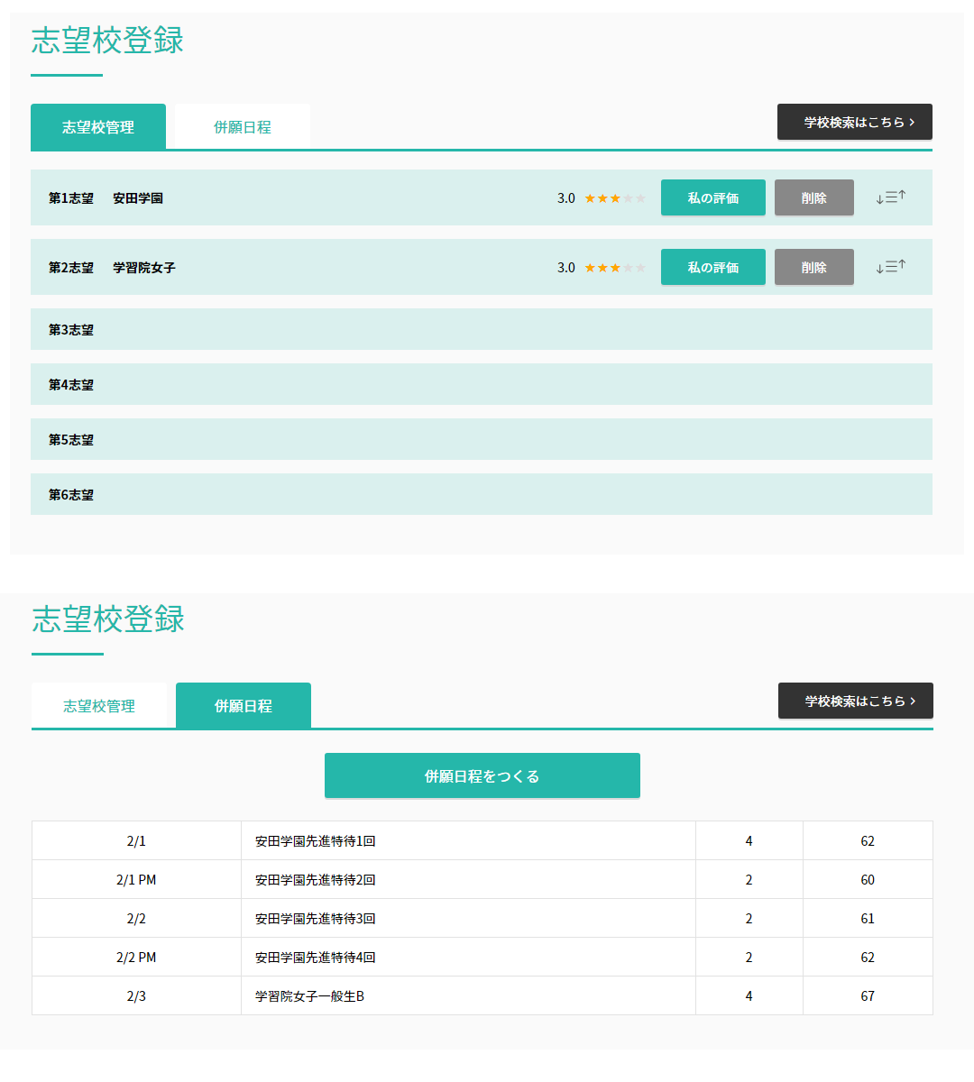 ※[志望校スコア]は学校説明会へ行った後などに5段階評価を各自で設定して保存しておくことが出来ます。