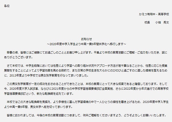 学校発表には、「2020年度大学入試改革、ならびに2021年度からの中学校学習指導要領改訂全面実施、さらに2022年度から年次進行での高等学校学習指導要領改訂という、新たな転換期を迎えています。本校ではこの大きな転換期を見据え、より多様性に富んだ学習環境の中で一人ひとりの個性を磨き上げるため、2020年度中学入学生より中高一貫6年間、男女共学へ舵を切ってまいります」とあります。