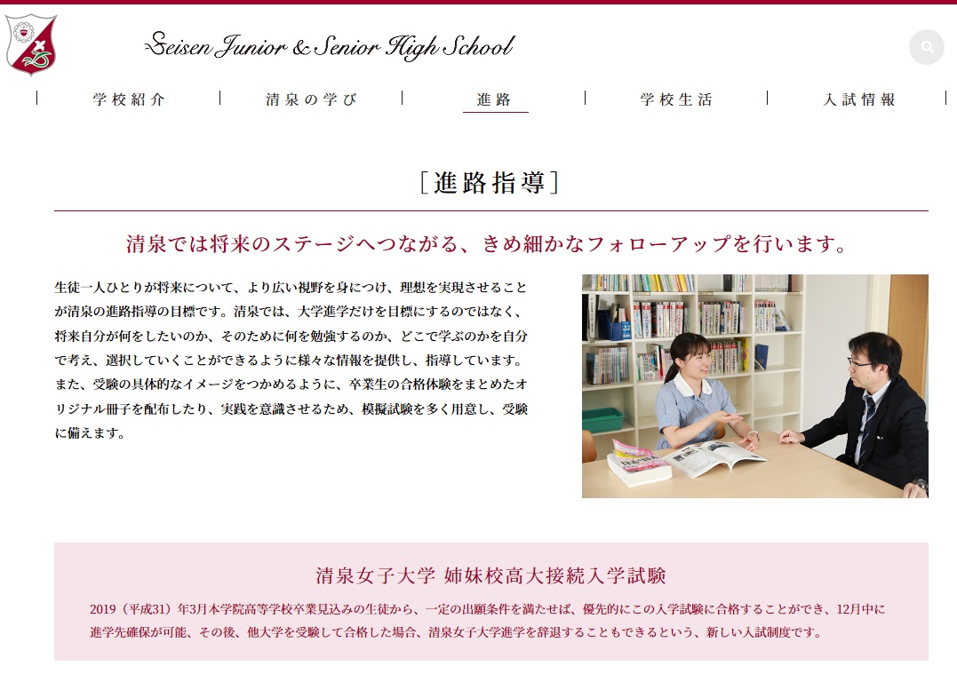 2019(平成31)年3月の清泉女学院高等学校卒業の生徒から、「清泉女子大学姉妹校高大接続入学試験」が制度としてスタートしました。これは、「一定の出願条件を満たせば、優先的にこの入学試験に合格することができ、12月中に進学先確保が可能、その後、他大学を受験して合格した場合、清泉女子大学進学を辞退することもできる」というもので、私立大学入試が厳しさを増す状況下、個々の進路実現に制度が寄与してくれることに期待が寄せられます。