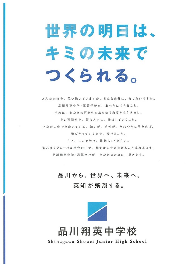 学校名の「品川翔英」は、「品川から世界へ、未来へ、英知が飛翔する」というコンセプトと想いが込められた名称だといいます。