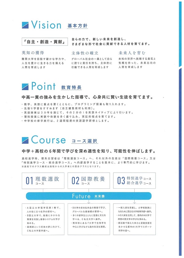 今回、4月25日の同校の説明会で打ち出された中学校・高等学校の「教育方針」は以下の通りです。