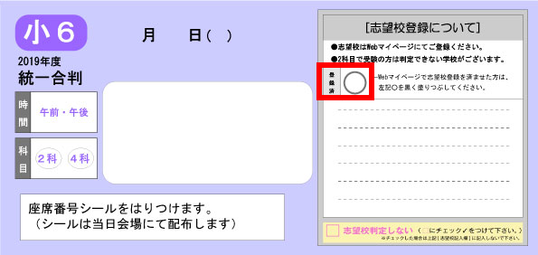Webマイページで志望校登録を済ませたら、受験票の右下にある『登録済』欄の○を黒く塗りつぶしてください。(赤枠部分)