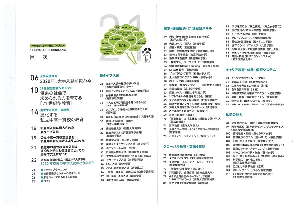 また、続いて後半では、中学受験で選択することのできる私立中学校・中高一貫校の教育について、「新タイプ入試」、「探究・課題解決・21世紀型スキル」、「グローバル教育・英語4技能」、「キャリア教育・体験・学習システム」、「私学の魅力」などについて、各校の具体的な取り組み(教育実践等)について、首都圏模試センターが取材してきたWeb記事のなかから抜粋してご紹介しています。