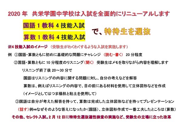 「2020年 共栄学園中学校は入試を全面的にリニューアルします」と題された同校からのお知らせには、来春から新設されるこの「国語1教科4技能入試」と「算数1教科4技能入試」について、以下のように紹介されています。