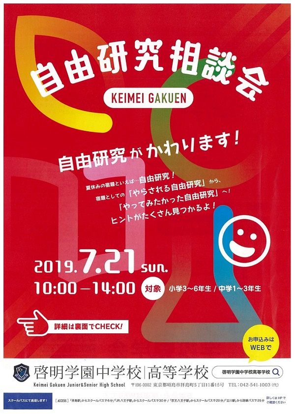 啓明学園中・高では、7月21日(日)小学校3~6年生と中学校1~3年生を対象にした「自由研究相談会」...